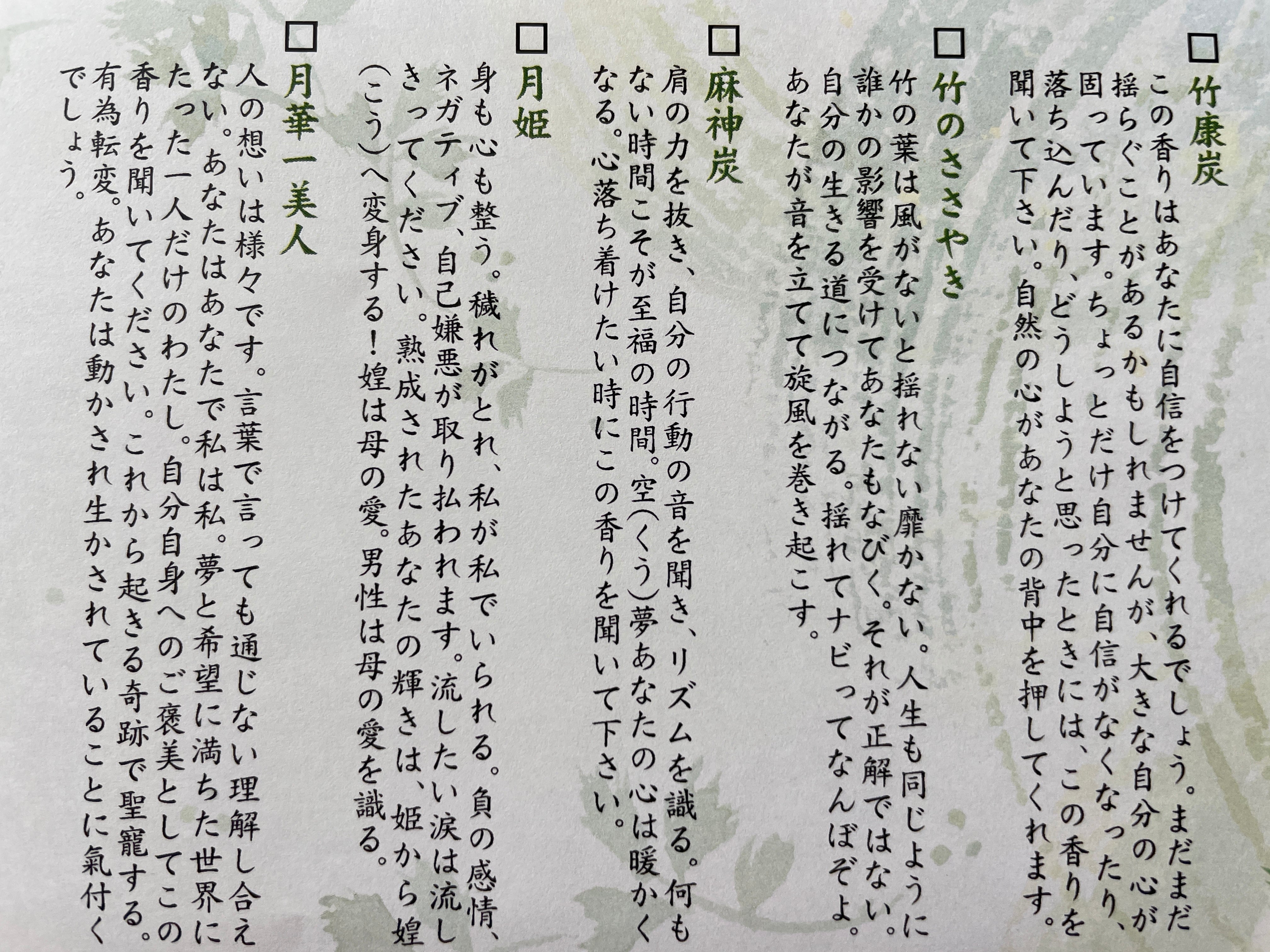 (白檀・藿香・甘松・丁子・零陵香・龍脳・安息香・貝香)